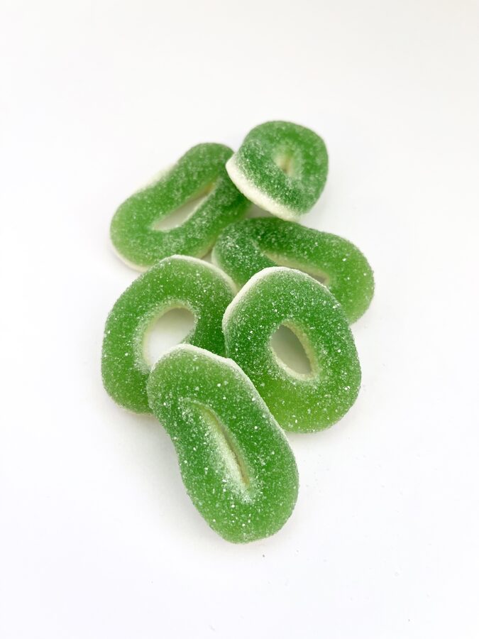 Soft, sugary and sour rings made of fruit gum and marshmallow with apple flavor. Free of fat and artificial colors.
