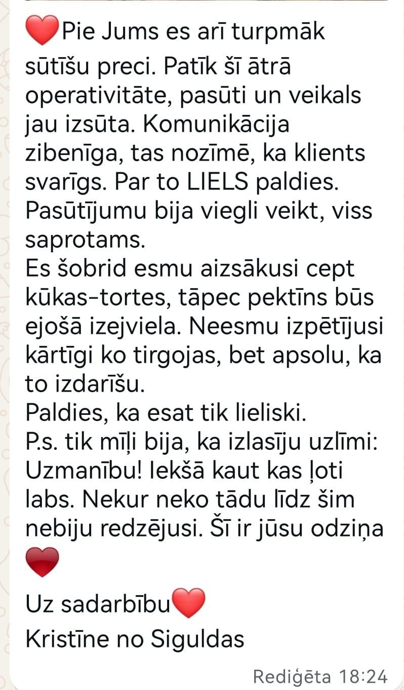 We deliver orders with Omniva, DPD, Smartpost, Latvijas Pastas throughout Latvia and beyond, and we also offer pickup at the green parcel machine in Cēsis, Pļavas Street 13 or at the ieber.lv store.