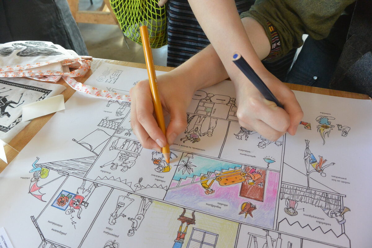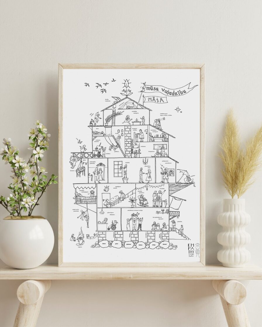 "The House of Our Needs" is a detailed black and white poster designed to be painted and collaborated with.
