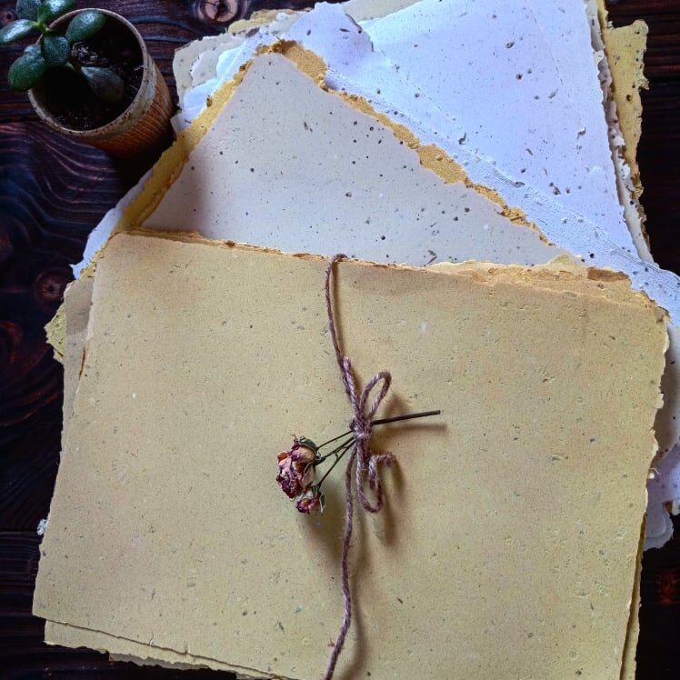 A4 design paper, 100% recycled, meticulously handmade. Each sheet is unique and unrepeatable.