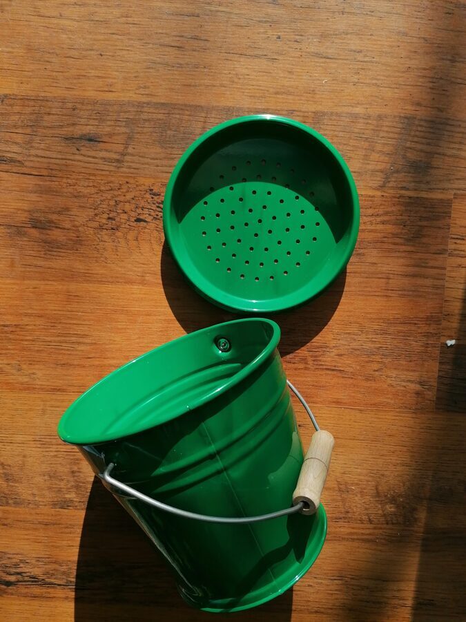 A durable metal bucket and strainer from @buerstenhaus.redecker is useful for sifting sand and gravel.