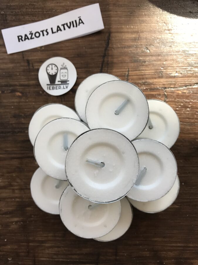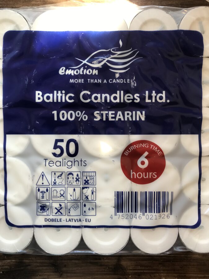 100% stearin tealight candles in aluminum containers. White with a light blue wick. 50 candles per package. Package weight 0.965 kg. 1 candle 37 x 21 mm. Burning time 6h ( in order for the intended candle burning duration to be met = all candle burning conditions must be observed - deviation from them can significantly affect both the burning duration and quality)!