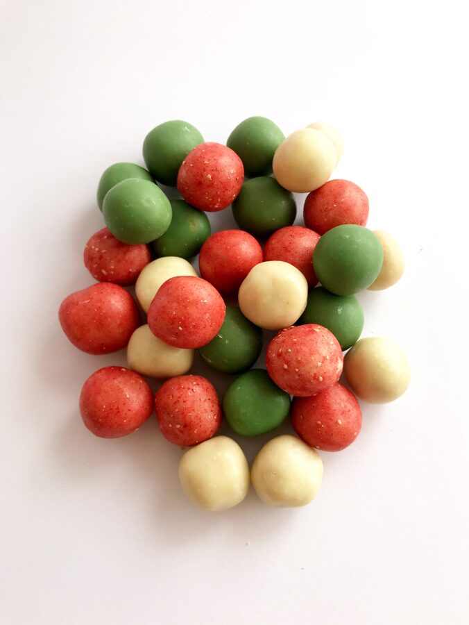 Šokolādes dražejas “Šokokraukšķi” MIX [baltā šokolāde 74 % (cukurs, kakao sviests (kakao sausā masa ne mazāk kā 28 %), PILNPIENA pulveris, emulgators – SOJAS lecitīns, dabīgs vaniļas aromatizētājs), graudaugu bumbiņas 24 % (KVIEŠU milti, KVIEŠU iesala milti, cukurs, KVIEŠU ciete, MIEŽU iesala ekstrakts, VĀJPIENA pulveris, sāls), zemeņu pulveris, piparmētru lapiņas, safloras un spirulīna ekstrakts (glicerīns, saflora, maltodektrīns, spirulīns, nesējviela), glazētājviela (ciete, saharoze, šellaka). Lazdu rieksti piena šokolādē [piena šokolāde 66% (cukurs, kakao sviests,PILNPIENA pulveris, kakao masa (kakao saturs 33,5%), emulgators - SOJAS lecitīns, dabīgs vaniļas ekstrakts), grauzdēti LAZDU RIEKSTI 34%, glazētājviela (ciete, saharoze, šellaka). "